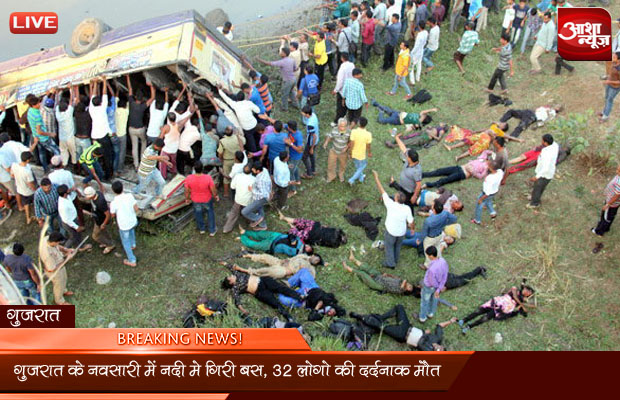 गुजरात: दक्षिण गुजरात के नवसारी जिले में राज्य परिवहन की एक बस के एक पुल से पूर्णा नदी में गिर जाने से 37 लोगों की मौत हो गई जबकि 24 अन्य घायल हो गए। नवसारी के पुलिस अधीक्षक एमएस भरदा ने बताया, पूर्णा नदी पर 20 फुट उंचे पुल से बस के गिर जाने से 37 लोगों की मौत हो गई जबकि 24 अन्य घायल हो गए हैं।पुलिस हादसे की जांच कर रही है।